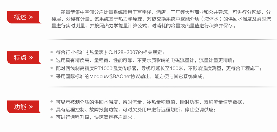 中央空調(diào)計(jì)費(fèi)系統(tǒng)是對(duì)各用戶的空調(diào)用量進(jìn)行獨(dú)立計(jì)量和收費(fèi),以計(jì)量為基礎(chǔ)、收費(fèi)為核心的系統(tǒng)。使用中央空調(diào)計(jì)費(fèi)系統(tǒng),能促進(jìn)節(jié)約能源,提高節(jié)能效益,減 少主機(jī)系統(tǒng)負(fù)荷,延長設(shè)備使用壽命;可實(shí)現(xiàn)空調(diào)能源商品化,用戶’“多用多交,少用少交”。滿足用戶按需使用、按量收費(fèi)的需求,有利于節(jié)能管理,符合國家節(jié)能政策。按照建筑物及業(yè)主使用的實(shí)際情況集中空調(diào)計(jì)費(fèi)系統(tǒng)分為以下三大類: